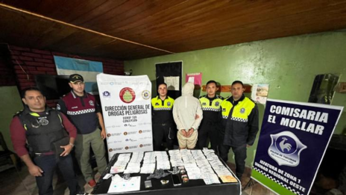 “En el camino, intentó descartar un envoltorio que mantenía oculto entre sus ropas y tras un palpado en el bolsillo derecho de la campera que traía, encontramos un envoltorio de plástico transparente con una sustancia vegetal y otro envoltorio con una sustancia blanquecina; además en el bolsillo derecho del pantalón tenía 1.210.700 pesos y un teléfono celular”, agregó el comisario principal.