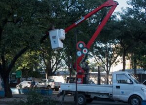 Por su parte, el director de Arbolado, Guillermo Olivera, detalló que este jueves se trabaja con el despeje de luminarias, que consiste en una poda de ramas que obstruyen los artefactos, para mejorar la iluminación nocturna y brindar más seguridad a la zona”.