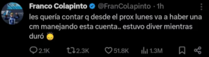 En los últimos días, el piloto también aprovechó esta situación para hacer una broma que mantuvo en alerta a los hinchas. “Les quería contar que desde el próximo lunes va a haber una CM manejando esta cuenta… estuvo divertido mientras duró”, escribió.