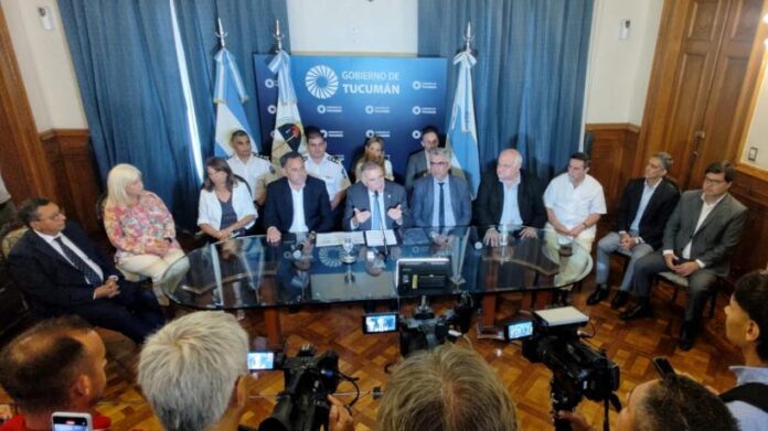 El mandatario tucumano, acompañado por todos los ministros del Poder Ejecutivo provincial, en una conferencia de prensa celebrada en Casa de Gobierno, recordó que por la quita momentánea del Impuesto a las Ganancias, el Incentivo Docente y la Compensaciones al Transporte este año no percibiremos 130 mil millones de pesos.