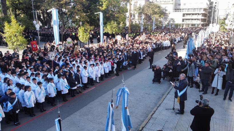En el marco del Día de la Bandera Nacional, fecha en la que se conmemora el 205° aniversario del fallecimiento del general, Manuel Belgrano, en la explanada de la Casa de Gobierno de Tucumán, el gobernador, Osvaldo Jaldo, tomó la promesa de lealtad a la insignia patria a 3.300 alumnos de 4° de escuelas públicas y privadas, y más 40 estudiantes adultos, pertenecientes a más de 60 escuelas de toda la provincia.