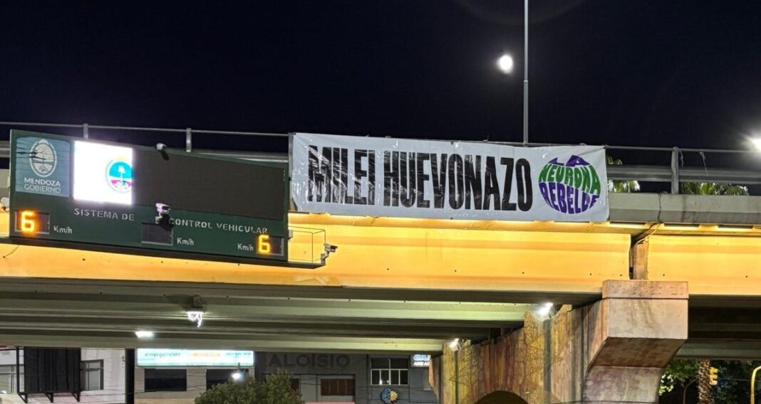 En ese contexto, un enorme cartel con la frase “Milei huevonazo” apareció colgado en un puente que une el Acceso Este con la Avenida Vicente Zapata. La imagen se viralizó rápidamente y se convirtió en el símbolo de la protesta en la provincia.