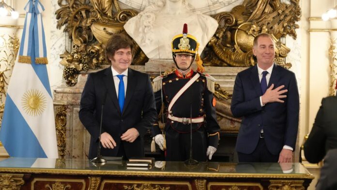 Este martes, Javier Milei le tomó juramento a Diego Santilli como nuevo ministro del Interior. La ceremonia fue en el Salón Blanco de Casa Rosada, con familiares, amigos y varios dirigentes del PRO mirando de cerca.
