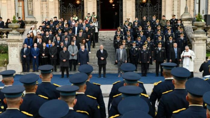 El gobernador, Juan Manzur, y el vicegobernador, Osvaldo Jaldo, tomaron juramento, este lunes por la mañana, a nuevos cadetes de policía egresados del Instituto de Enseñanza Superior de Policía General San Martín y realizaron el nombramiento de personal transitorio policial y del personal para el Servicio Penitenciario de la Provincia, en la explanada de Casa de Gobierno.